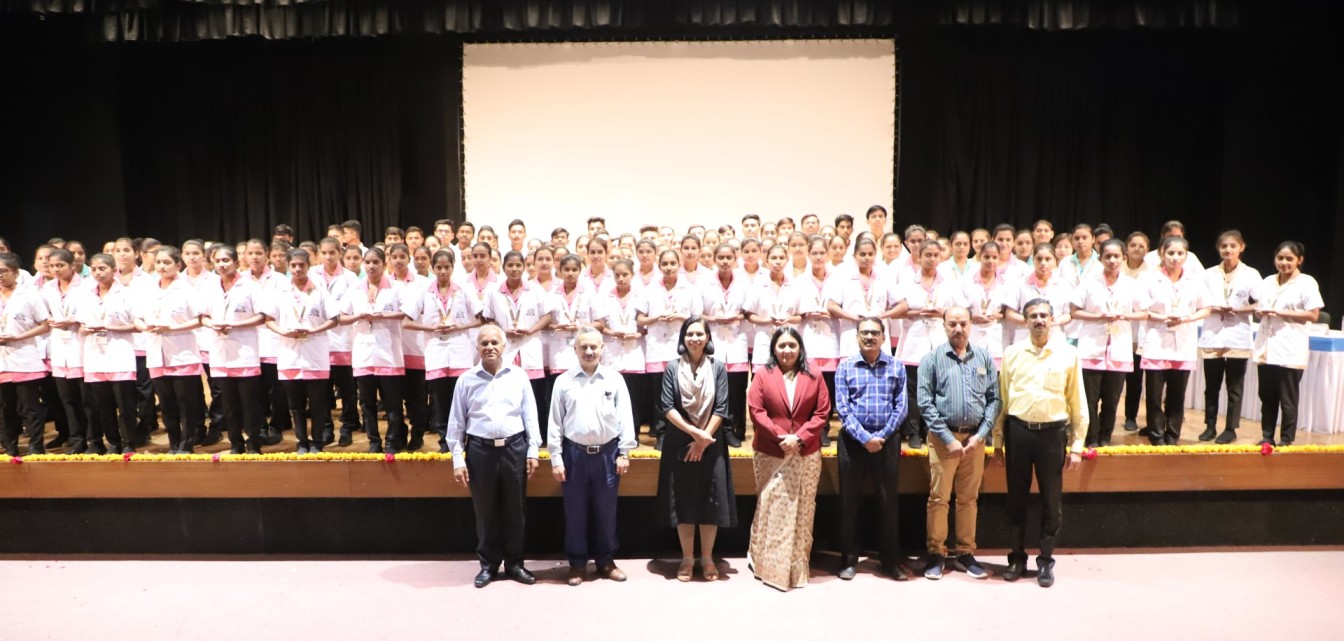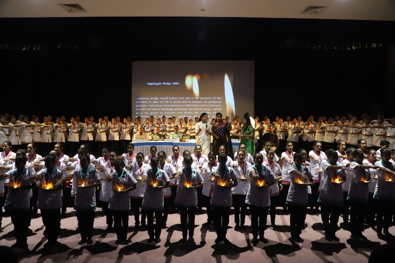 Lamp lighting and Oath Taking Ceremony is an auspicious occasion in every Nurse’s life. It is held in reverence to Florence Nightingale (Lady with the Lamp) to encourage the new batch of students entering into the hospital to offer comprehensive care to the patients. Parul Institute of Nursing organized Oath Taking and Candle Light Ceremony on March 15, 2019 in which a total of 70 students of B.Sc(Basic) Nursing, 58 students of GNM and 18 students of ANM remained present and took an oath to commit themselves to the noble profession of nursing by providing comprehensive care to the patients and serving them with compassion, dedication and humility. Dr.Pragna Dabhi, Registrar, Gujarat Nursing Council was invited as the Chief Guest during the said occasion while Shri.I.A.Kadiwala, Vice President, Gujarat Nursing Council was invited as the Guest of Honour. It was indeed a moment of pride for all the nursing students to take an oath in the august presence of Vice President and Registrar of Gujarat Nursing Council.